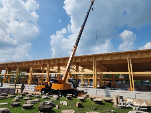 현장에 가까이 다가서자 35도를 훌쩍 넘는 찜통더위에도 많은 인부들이 굵은 땀방울을 흘리며 거대한 목조 자재를 옮기고, 자르고, 붙이고 있었다.