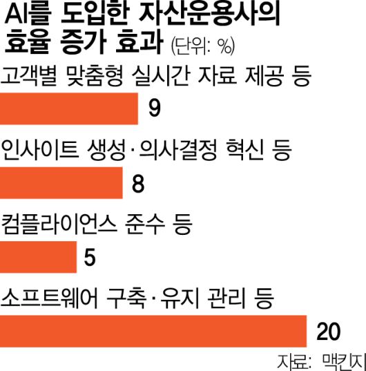 글로벌 컨설팅 업체 맥킨지는 지난달 자산운용사들이 AI와 생성형 AI, 에이전틱 AI 등을 어떻게 활용하느냐에 따라 원가를 최대 43%까지 줄일 수 있다는 분석 결과를 발표했다. 투자 프로세스 간소화, 규정 준수 자동화 등 각 분야에서 AI 가치 창출이 가능하다는 것이다. AI가 기업 실적 발표나 재무 보고서 등을 종합해 의미 있는 정보를 만들어내면 애널리스트가 이를 바탕으로 포트폴리오를 구성하는 등 활용 방안도 다양하다.