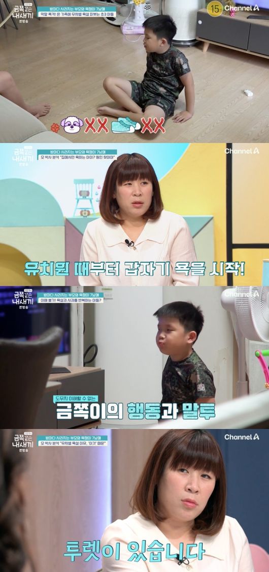 오은영 박사는 “금쪽이의 문제는 욕을 많이 한다. 욕은 언어 발달하고 아주 관련이 깊다. 감정을 다양한 언어를 써야 하는데 그게 다양하게 습득이 안 되면 비가 와도, 물이 젖으며 욕해, 배가 고파도 욕을 한다. 모든 감정을 평상시에도 욕으로 표현을 할 거다”라고 분석했다.