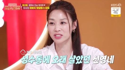 장신영은 "저희가 성수동이 개발되기 전부터 살았다. 지인들이 거기 집이나 땅을 사라고 정보를 줬는데 아빠가 무서워서 하지 말라고 했다"고 떠올렸다.