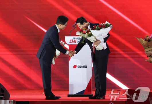(청주=뉴스1) 신웅수 기자 = 22일 충북 청주시 청주오스코에서 열린 국민의힘 제6차 전당대회에서 당대표 결선투표에 오른 김문수·장동혁 후보가 악수를 하고 있다. (공동취재) 2025.8.22/뉴스1 Copyright ⓒ 뉴스1. All rights reserved. 무단 전재 및 재배포, AI학습 이용 금지.