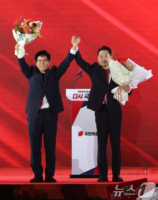 (청주=뉴스1) 신웅수 기자 = 22일 충북 청주시 청주오스코에서 열린 국민의힘 제6차 전당대회에서 당대표 결선투표에 오른 김문수·장동혁 후보가 당원들에게 인사하고 있다. (공동취재) 2025.8.22/뉴스1 Copyright ⓒ 뉴스1. All rights reserved. 무단 전재 및 재배포, AI학습 이용 금지.