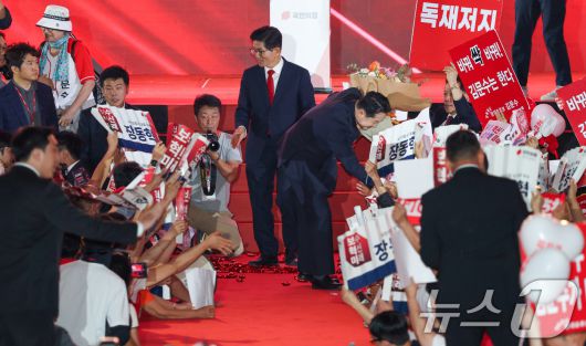 (청주=뉴스1) 신웅수 기자 = 22일 충북 청주시 청주오스코에서 열린 국민의힘 제6차 전당대회에서 당대표 결선투표에 오른 김문수·장동혁 후보가 당원들에게 인사하고 있다. (공동취재) 2025.8.22/뉴스1 Copyright ⓒ 뉴스1. All rights reserved. 무단 전재 및 재배포, AI학습 이용 금지.