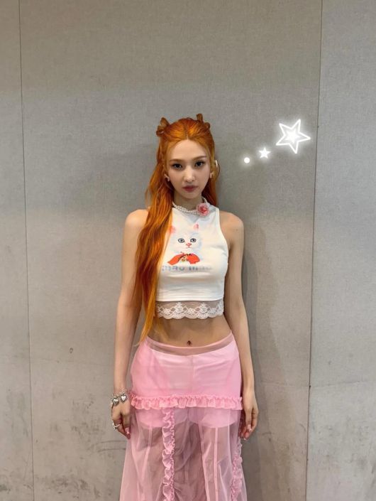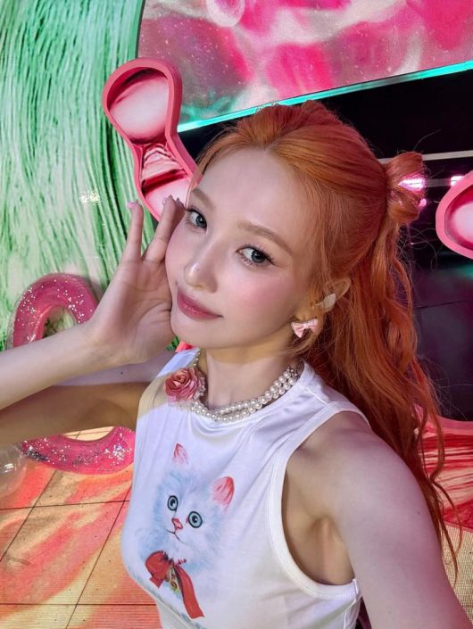 사진 속 조이는 오렌지 컬러 헤어를 반묶음으로 묶어 발랄한 매력을 드러냈다. 풍성한 웨이브가 자연스럽게 흘러내리며 무대 위 활기찬 에너지를 더했다.