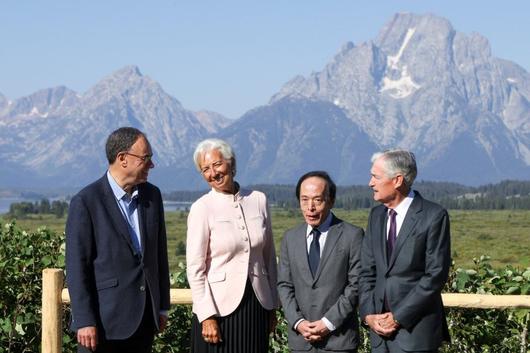 제롬 파월(오른쪽 첫 번째) 미국 연방준비제도(연준) 의장이 22일(현지시간) 와이오밍주 잭슨홀 콘퍼런스에서 9월 금리 인하를 시사하면서 뉴욕 증시가 이날 사상 최고 기록을 경신했다. 파월 의장이 22일 잭슨홀에서 앤드루 베일리(오른쪽 4번째) 영국은행(BOE) 총재, 크리스틴 라가르드 유럽중앙은행(ECB) 총재, 우에다 카즈오 일본은행(BOJ) 총재와 대화하고 있다. 로이터 연합 |