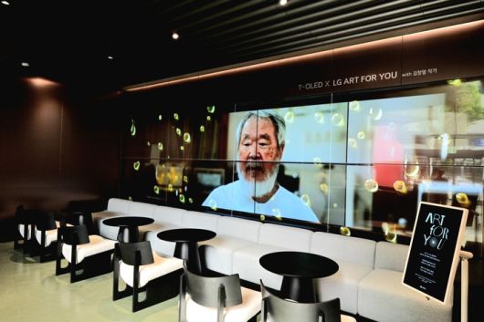 1층 맞이 공간에서는 고객이 상담을 기다리는 동안 LG전자의 OLED 기술로 구현된 예술 작품을 감상할 수 있다. 투명 OLED 기반의 디지털월에서는 LG전자가 후원하는 한국 현대미술 작품이 전시된다. 사진은 고(故) 김창열 화백의 대표작 ‘물방울을 그리는 남자’. LG전자 |