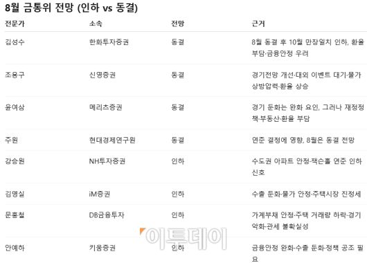 조용구 신영증권 연구원도 동결 전망을 제시했다. 그는 “경제전망 개선과 9월 FOMC 등 대외 이벤트 대기 요인이 크다”며, “물가 상방 압력과 환율 상승도 고려해야 한다”고 설명했다.