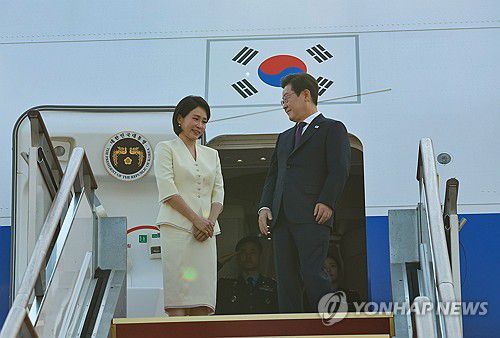 (성남=연합뉴스) 홍해인 기자 = 이재명 대통령과 김혜경 여사가 일본·미국 방문을 위해 23일 성남 서울공항에서 공군 1호기에 탑승하고 있다. 2025.8.23