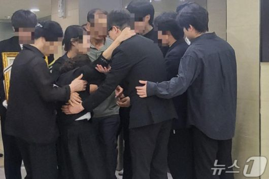 23일 오전 경북 청도군 대남병원 장례식장에서 무궁화호 열차 사고로 숨진 조모씨(30)의 발인이 진행됐다. 유족은 조 씨의 친구들을 붙잡고 오열하고 있다.2025.8.23/뉴스1 ⓒ News1 이성덕 기자 |