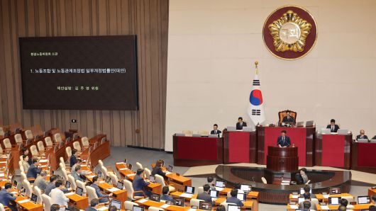 노동조합법 개정안, 이른바 노란봉투법이 오늘(23일) 국회 본회의에 상정돼 처리 절차를 밟고 있습니다.