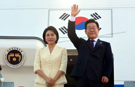 이재명 대통령과 김혜경 여사가 한·일, 한·미 정상회담 일정을 위해 23일 성남 서울공항을 출발하며 공군 1호기에 올라 인사하고 있다. 연합뉴스 |