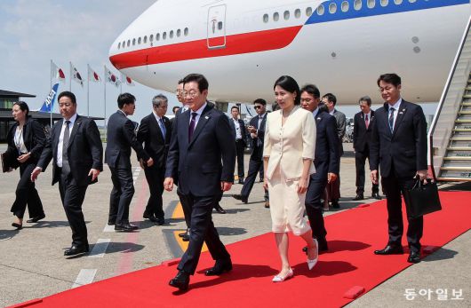 한일정상회의 참석차 일본을 방문한 이재명 대통령과 부인 김혜경 여사가 23일 하네다 국제공항에 도착해 공군 1호기에서 내리고 있다. 2025.08.23 송은석 기자 silverstone@donga.com |