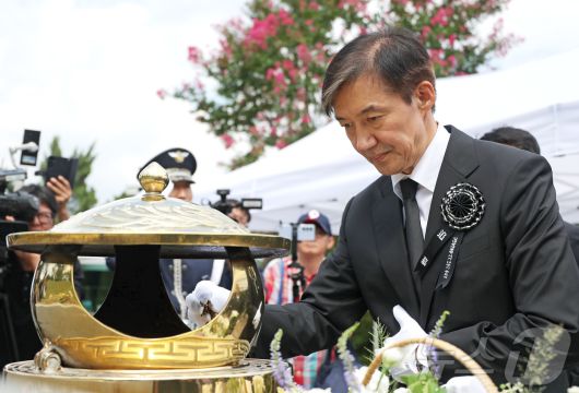 조국 전 조국혁신당 대표가 지난 18일 서울 동작구 국립서울현충원 내 김대중 전 대통령 묘역을 찾아 참배를 하고 있다. (공동취재) 2025.8.18/뉴스1 ⓒ News1 박정호 기자 |