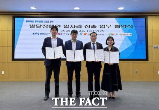 전북도는 22일 도청 중회의실에서 한국도로공사 전북본부, 창혜복지재단, 한남상사와 함께 발달장애인의 직업훈련과 취업 연계를 위한 민관 협력 업무협약을 체결했다고 23일 밝혔다.
