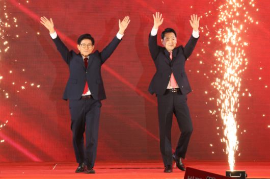 ▲22일 충북 청주시 청주오스코에서 열린 국민의힘 제6차 전당대회에서 당대표 결선투표에 오른 김문수·장동혁 후보가 무대에 오르고 있다. ⓒ연합뉴스 |