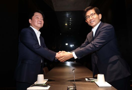 김문수 국민의힘 당대표 후보가 23일 서울 여의도의 한 식당에서 안철수 의원과 오찬회동을 하기 전 악수를 하고 있다. 뉴시스 |