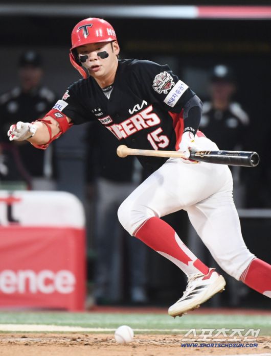 21일 수원 KT위즈파크에서 열린 KIA-KT전. 4회초 무사 1, 2루 박정우가 희생번트를 시도하고 있다. 수원=정재근 기자 cjg@sportschosun.com/2025.5.21/ |
