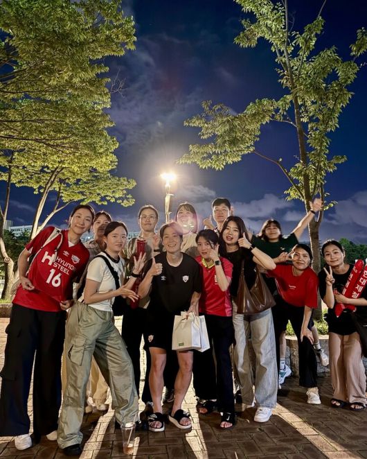 FC돌핀즈는 2025년 7월21일 박예은 선수(왼쪽 다섯째 검정 셔츠 입은 이)가 뛰고 있는 인천 현대제철 경기에 단체 직관을 가서 함께 사진을 찍었다. 김정아 제공 |