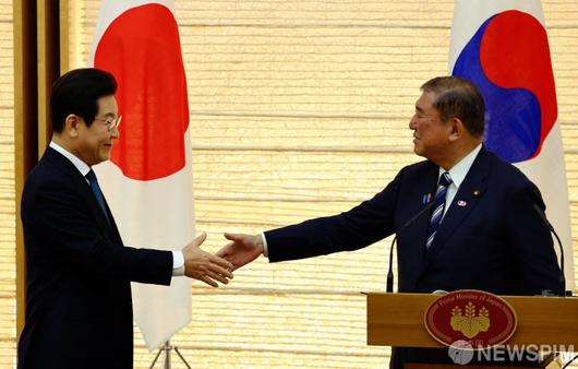 [도쿄 로이터=뉴스핌] 이재명 대통령이 23일 일본 도쿄 총리 관저에서 이시바 시게루 일본 총리와 공동언론발표를 앞두고 악수를 하고 있다. 2025.08.23 photo@newspim.com |