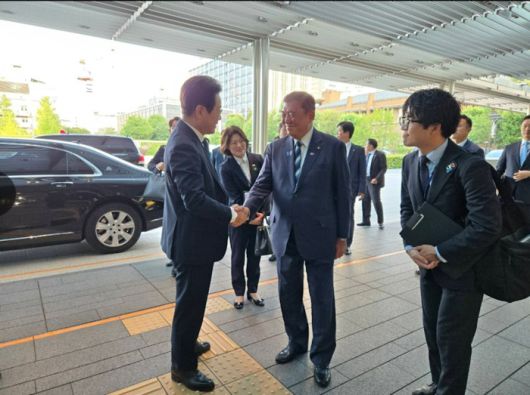 이시바 시게루 총리가 23일 일본 도쿄 총리관저를 방문한 이재명 대통령(왼쪽)을 맞이하고 있다. [이시바 시게루 트위터] |
