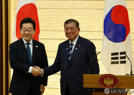 [도쿄 로이터=뉴스핌] 이재명 대통령이 23일 일본 도쿄 총리 관저에서 이시바 시게루 일본 총리와 공동언론발표를 앞두고 악수를 하고 있다. 2025.08.23 photo@newspim.com