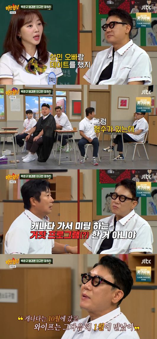 이에 이수근이 "그럼 형수가 있는데 캐나다 가서 미팅하는 거짓 프로그램한 거 아니냐. 너희 고모부 장난 아니다"라며 놀랐다. 이상민은 "캐나다는 10월에 갔고, 와이프는 그다음 해 1월에 만났다"라고 해명했다. 강호동은 "아슬아슬했네"라고 전했다.