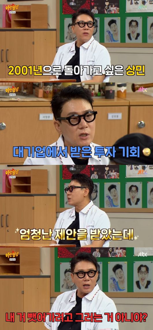 이상민은 "굉장히 엄청난 제안이었는데 내가 배운 게 없으니까 체계적으로 이해를 못 했다. 그냥 '투자를 하겠다'면서 왔는데, 머릿속에서 단순히 '내 거 뺏어가려는 거 아닌가?'(했다)"라며 당시를 회상했다.