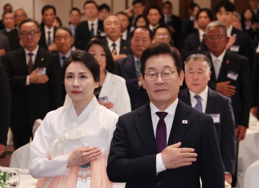 이재명 대통령과 김혜경 여사가 23일 일본 도쿄의 한 호텔에서 열린 재일동포 오찬 간담회에서 국기에 경례하고 있다. 2025.8.23 |