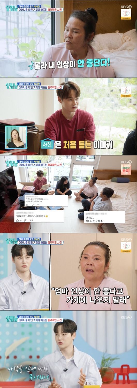 이를 들은 박서진은 분노하면서 “엄마가 가게 나가기 싫다고 했다더라. 사람들 앞에 서기 무서워서 그랬다더라. 얘기로 들어도 속상한데 엄마는 얼마나 속상하고 마음이 아플까. 나 때문인 것 같아서 죄송하다”라고 미안한 마음을 드러냈다.