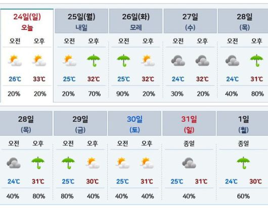 기상청은 일요일인 24일 전국날씨 낮최고기온 서울 33도, 대전 35도, 광주 33도, 강릉 34도, 대구 36도, 부산 33도, 제주도 33도를 기록하며 무더위 날씨예보했다.