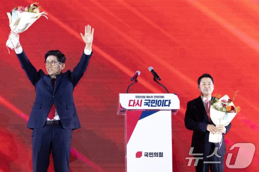 국민의힘 당 대표 결선투표 진출자 김문수(왼쪽), 장동혁 후보가 지난 22일 오후 충북 청주시 오스코에서 열린 제6차 전당대회에서 꽃다발을 들고 인사하고 있다. (공동취재) 2025.8.22/뉴스1 ⓒ News1 신웅수 기자 |