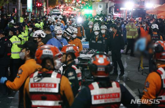 [서울=뉴시스] 김진아 기자 = 2022년 10월 29일 밤 서울 용산구 이태원 일대에서 대규모 압사사고가 발생해 30일 새벽 소방구급 대원들이 사망자를 이송하기 위해 대기하고 있다. 2022.10.30. bluesoda@newsis.com |