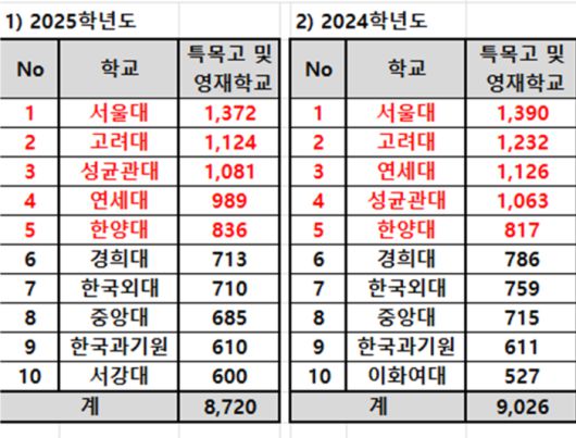 특목·자사고 합격자 수 상위 10개 학교의 전체 합격 인원은 2024학년도 9026명에서 2025학년도 8720명으로 3.4% 감소했다.