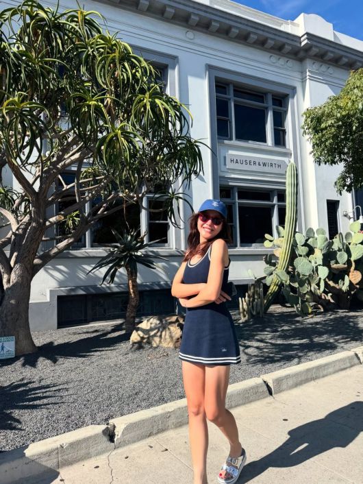 짧은 기장에 대해 직접 짧지만 용기내서라고 밝힌 만큼 과감하면서도 건강한 자신감이 돋보이는 휴가 스타일링이 빛난다. 미술관과 편집숍을 누비는 도시 여행자 콘셉트로,스포츠 무드의 테니스 원피스에 캡과 플랫폼 슬리퍼를 더해 한여름에 딱 맞는 데일리 룩을 완성했다.
