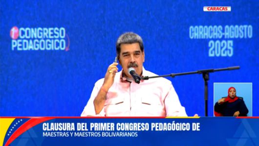 지난 15일(현지시간) 베네수엘라 대통령실의 유튜브에 올라온 니콜라스 마두로 베네수엘라 대통령의 제1회 볼리바르 교사 교육학 대회 폐막연설 영상. 마두로 대통령이 중국 화웨이폰으로 시진핑 중국국가주석과 통화하는 듯한 모습을 연출하고 있다. 사진 유튜브 |