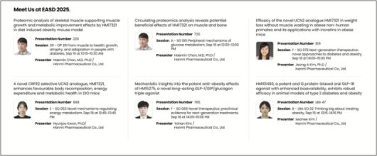 회사 측은 이번에 연구결과를 발표하는 후보물질이 차세대 비만치료 삼중작용제 ‘HM15275’, 신개념 비만치료제 ‘HM17321’, 먹는 비만치료제 ‘HM101460’이라여 이같이 전했다. 한미약품은 학회에서 HM15275의 강력한 항비만 효과에 대한 기전적 통찰, HM17321의 근육 성장 및 대사 개선 효과를 뒷받침하는 골격근 단백체 분석, HM17321의 비만 영장류 모델에서 체중 감량 효능 및 설치류 모델에서 인크레틴 병용 효능 등을 소개할 계획이다. 아울러 △HM17321의 체성분 개선, 에너지 소모 및 대사 건강 증진 효과 △혈액 단백체 기반 HM17321의 근육 및 골격 건강에 대한 잠재적 이로운 효과 △HM101460의 경구용 GLP-1 작용제 가능성도 발표한다.