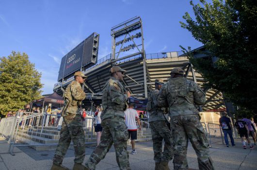 23일(현지시각) 워싱턴디시에서 디시유나이티드 대 인터마이애미 경기가 열리는 축구전용경기장 아우디필드 앞을 주방위군들이 지나가고 있다. 워싱턴/AP연합뉴스 |
