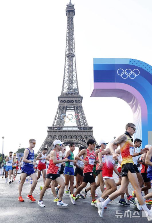 [파리=뉴시스] 최동준 기자 = 1일 (현지시각) 프랑스 파리 에펠탑 인근 트로카데로에서 열린 2024 파리 올림픽 육상 경보 남자 20km 결승에서 선수들이 레이스를 펼치고 있다. 2024.08.01.photocdj@newsis.com