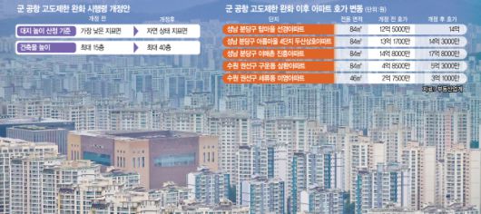 정부가 군 공항 주변의 건축 고도 제한을 완화하면서 경기 성남과 수원 등 군 공항 인접 재건축 단지의 사업성이 대폭 개선됐다. 성남 군 공항의 비행안전구역 변경과 더불어 고도 제한 완화로 분당 야탑·이매동 10개 단지에 대한 재건축 기대감이 커진 것이다. 이들 단지는 최대 40층 건립이 가능해져 전용 84㎡ 매매 호가가 기존보다 3억 원 이상 오르는 등 1기 신도시 일대의 새로운 축으로 발돋움하는 상황이다.