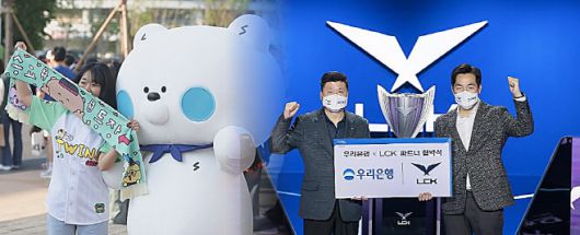 신한은행 KBO 브랜드데이 행사(왼쪽), 우리은행-LCK 타이틀스폰서 업무협약식. / 신한은행, 우리은행 |