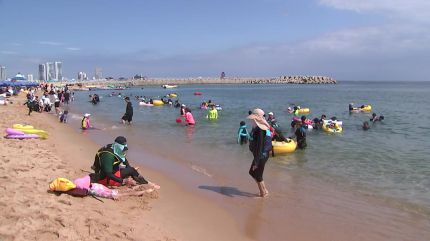 바닷가 모래사장이 파라솔과 인파로 가득합니다.
