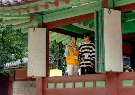 현장영상해설사(왼쪽)와 시각장애인 참가자가 궁궐을 둘러보고 있다. 서울관광재단 제공 |