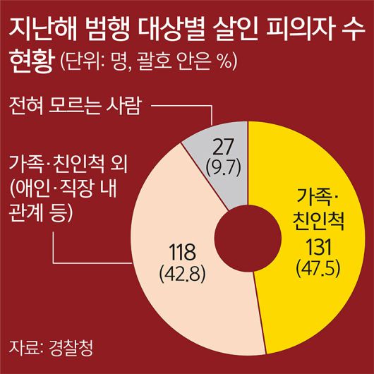 24일 경찰청 ‘2024 범죄통계’에 따르면 지난해 검거된 살인 혐의 피의자 276명 중 배우자·부모·자녀·친인척 등을 상대로 범행을 저지른 경우가 131명(47.5%)에 달했다. 이 수치는 2020∼2022년에는 30% 안팎 수준에 그쳤지만, 2023년 전 배우자나 사실혼 관계를 포함하며 55.1%(290명 중 160명)로 치솟았고 지난해에도 절반 가까운 비중을 차지했다.