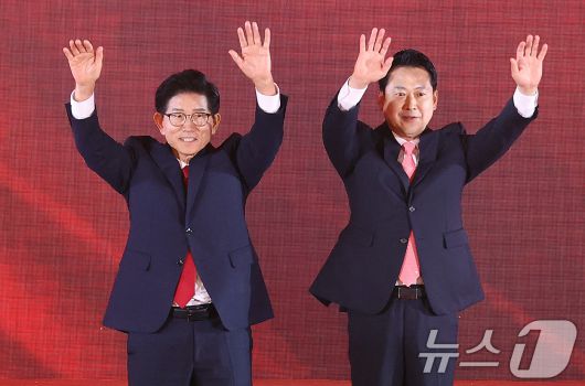 김문수, 장동혁 국민의힘 대표 후보가 22일 오후 충북 청주 오스코에서 열린 국민의힘 제6차 전당대회에서 결전 진출에 성공한 뒤 손을 들어 인사하고 있다. (공동취재) 2025.8.22/뉴스1 ⓒ News1 신웅수 기자 |