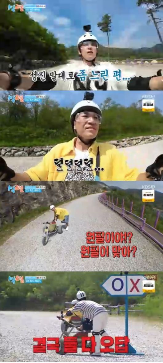 김종민은 몸을 앞으로 숙이면 앞으로 간다는 것을 알고 도운에게도 알려줬다. 두 사람은 덤앤더머처럼 움직이더니 늦게 들어왔다.