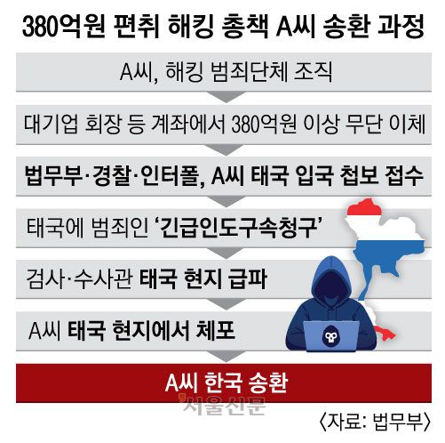 지난 5월 8일 찌는 듯한 더위 속 태국 방콕. 서울에서 급파된 경찰과 태국 현지에 파견된 경찰 협력관, 태국 경찰 등이 도심 외곽 후미진 건물에 은신해 있던 A(34·중국 국적)씨를 급습했다. A씨는 국내 대기업 회장을 비롯해 방탄소년단(BTS) 정국 등 유명 인사들의 개인정보를 해킹해 이들의 금융계좌에서 무단으로 380억원 이상을 편취한 불법 해킹 조직의 총책이다. A씨는 체포 당시에도 다수의 조직원과 함께 컴퓨터 앞에서 작업 중이었다고 한다. 현장에서 체포된 짧은 머리의 A씨는 지난 22일 인천공항을 통해 송환돼 24일 정보통신망법 위반 등의 혐의로 구속됐다.