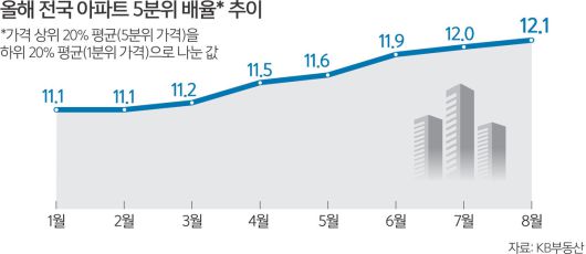 KB부동산 관계자는 “상위 아파트 가격이 오르면서 5분위와 1분위(하위 20%) 아파트 가격 차이를 나타내는 5분위 배율은 12.1로 벌어졌다”고 짚었다. 5분위 배율은 아파트 가격 상위 20% 평균(5분위 가격)을 하위 20% 평균(1분위 가격)으로 나눈 값으로, 배율이 높을수록 상하위 가격 격차가 크다는 뜻이다. 이달 전국 아파트 5분위 배율은 KB부동산이 관련 집계를 시작한 2008년 12월 이래 가장 크다.