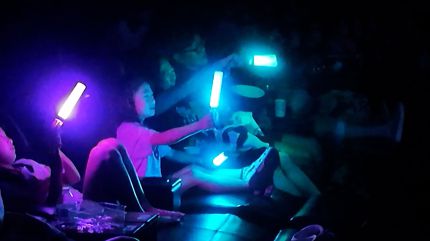 영화 배경 음악에 맞춰 야광봉을 흔들고 어깨를 들썩입니다.