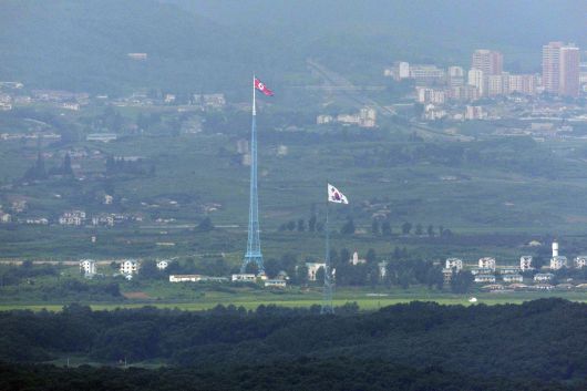 지난 19일 경기도 파주시 접경지역에서 바라본 서부전선 비무장지대(DMZ)에서 남측 대성동 마을 태극기와 북측 기정동 마을 인공기가 펄럭이고 있다./연합뉴스 |