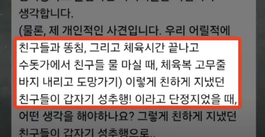 그는 또 “백초크로 기절시키고 바지를 벗긴 행동이 학교폭력이라는 건 받아들이는 사람의 표현에 달린 것”이라며 “잘못을 사과하고 용서를 비는데 받아주지 않는 것도 잘못이다. 그들은 모두 어리석은 사람”이라고 말했다. 이어 “잘못을 저지르고 뉘우치는 건 훌륭한 일이고, 그 잘못을 용서하는 건 더 훌륭한 일”이라고 덧붙였다.